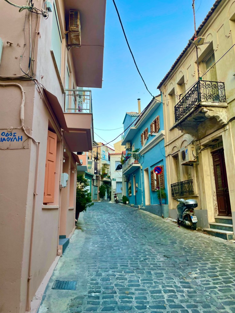 Pasteller i ulike varianter, farger som turkis, fersken, rosenrød, dempet grønn, blåtoner, rosa og gultoner smykker bygningene i den lille byen jeg tilbrakte ferien min, Plomari, på den greske øya Lesvos